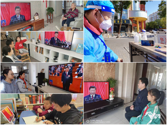 当雄壮的中华人民共和国国歌奏响时,机关和事业单位集中收看会场的同志们全体起立共唱国歌,居家隔离、下沉社区、驻企督导疫情防控的党员干部通过电视、手机同步收看,共同见证这一伟大光荣的历史盛会,认真聆听习近平同志代表第十九届中央委员会向大会作的报告,及时感悟党中央开启全面建设社会主义现代化国家新征程、向第二个百年奋斗目标进军的号角宣言。在近两个小时的时间里,大家聚精会神、边听边记,倍感振奋和鼓舞,心潮久久不能平息。