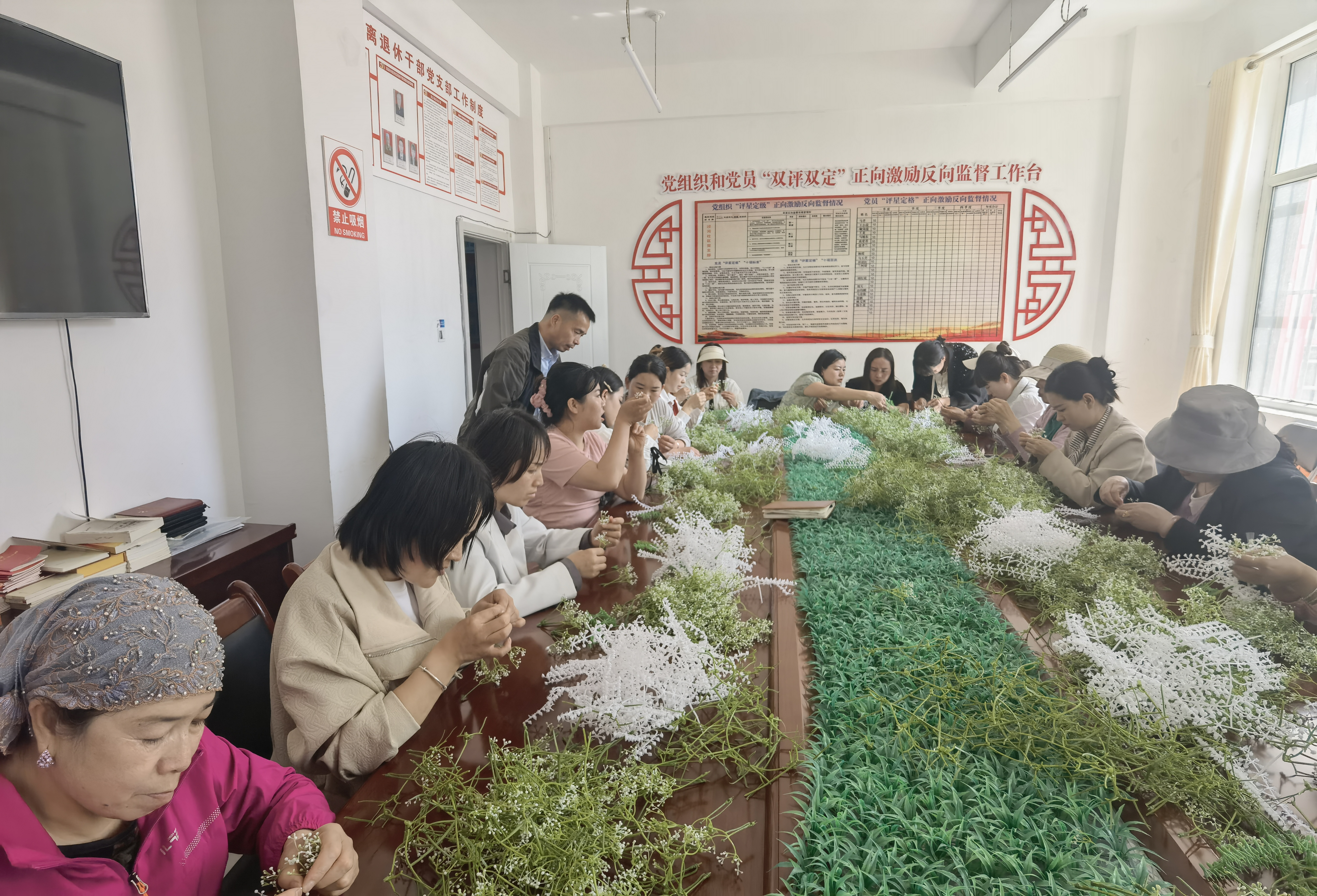 塑编花加工坊方面。在社区设立手工插花帮扶点,企业提供技能培训和技术支持,以解决社区及周边富余劳动力的就业问题。帮扶工作队、社区两委确定细节,企业指定专人负责提供原料和技术指导,按照示范带动、逐步扩大范围的推进思路,先后培树3到5名业务能手,并按照完工产品数量给予适当补贴,让社区移民真切感受到劳动创造财富的快乐。初步测算,今年将会有社区及周边妇女50人参加插花行动,人均月收入超过千元。