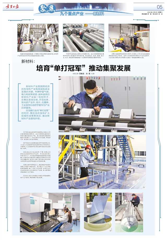 新材料产业是国民经济的先导性产业和高端制造业发展的关键。利用宁夏气候、电力和政策优势,越来越多的新材料产业如一粒粒种子,在我区落地生根、开花结果。除光伏产业外,硅片、石墨烯、工业蓝宝石也把宁夏作为产业的承接地。