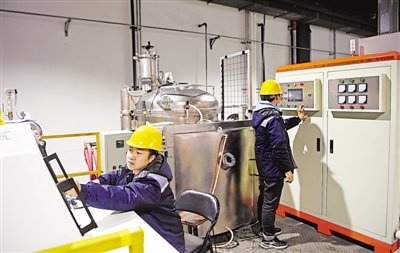 石嘴山先进材料协同创新工程中心车间内,工作人员正在查看悬浮熔炼炉的生产情况。该中心为新材料科研项目产业化过程中,工业化技术研究平台和团队欠缺这一难题提供解决之道。