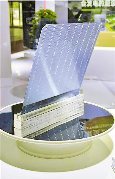 ④第五届中阿博览会上,隆基绿能科技股份有限公司展示单晶电池。我区建立了从太阳能级单晶硅棒、硅片、电池、光伏组件、分布式光伏电站到地面光伏电站的全产业链,成为重要的单晶硅切片生产基地。