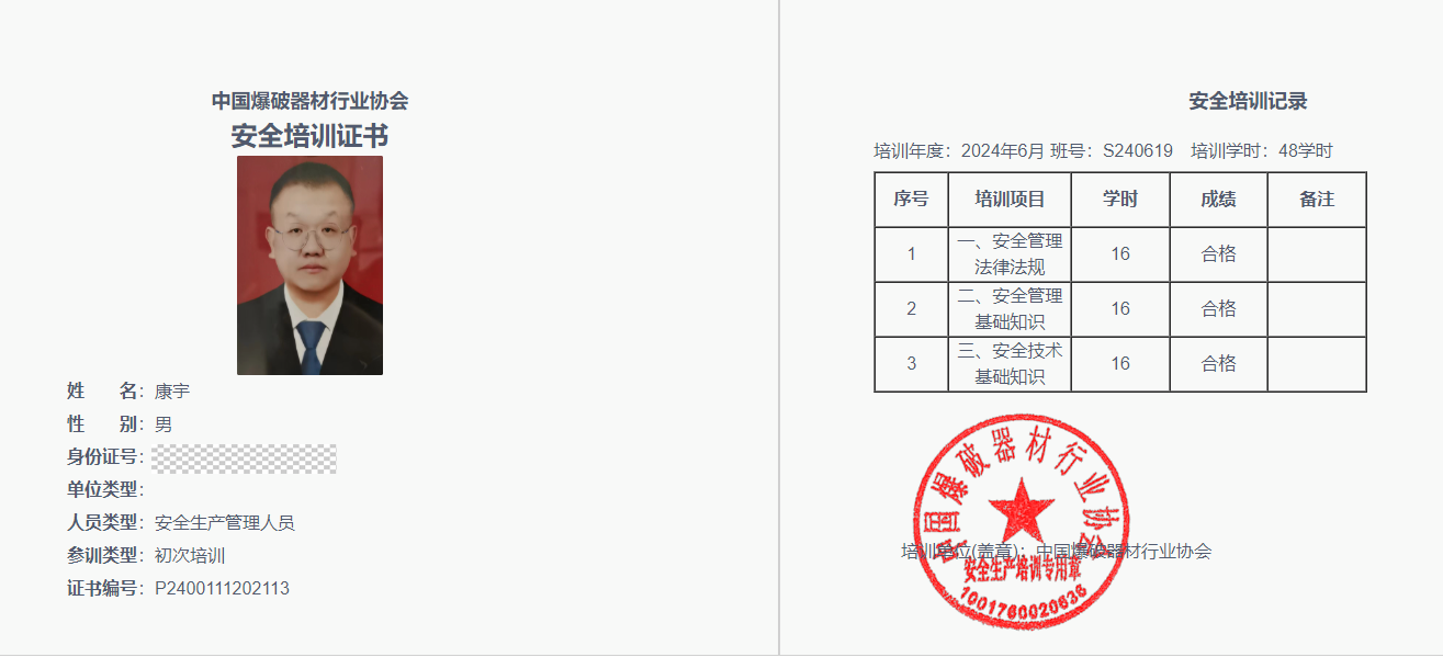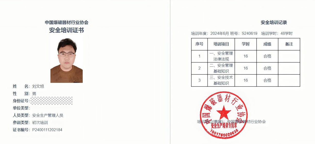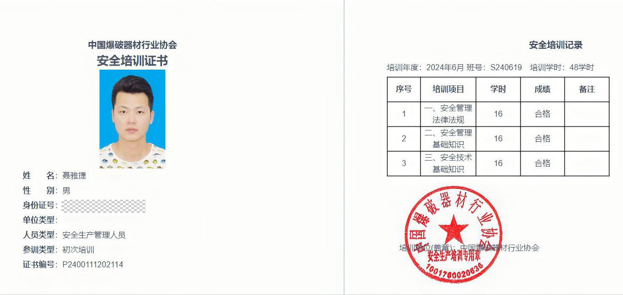 根据我厅民爆行业2024年度安全生产培训工作安排,2024年度民用爆炸物品生产和销售企业初次取证的安全管理人员聂雅捷(灵武市安顺民爆器材销售有限公司)、刘文旭(银川恒泰翔民爆器材有限公司)、康宇(吴忠市太阳山开发区福龙民爆器材服务有限责任公司)、马静(固原安保民爆器材经销有限责任公司),参加了中国爆破器材行业协会举办的安全生产培训班,均完成了规定的48学时且考核成绩合格,现已结业。依据《安全生产法》《民用爆炸物品安全管理条例》《民用爆炸物品生产和销售企业安全生产培训管理办法》(工信厅安全〔2018〕77号)有关规定,对以上4人颁发民爆行业安全生产知识和管理能力考核合格证,特此通知。