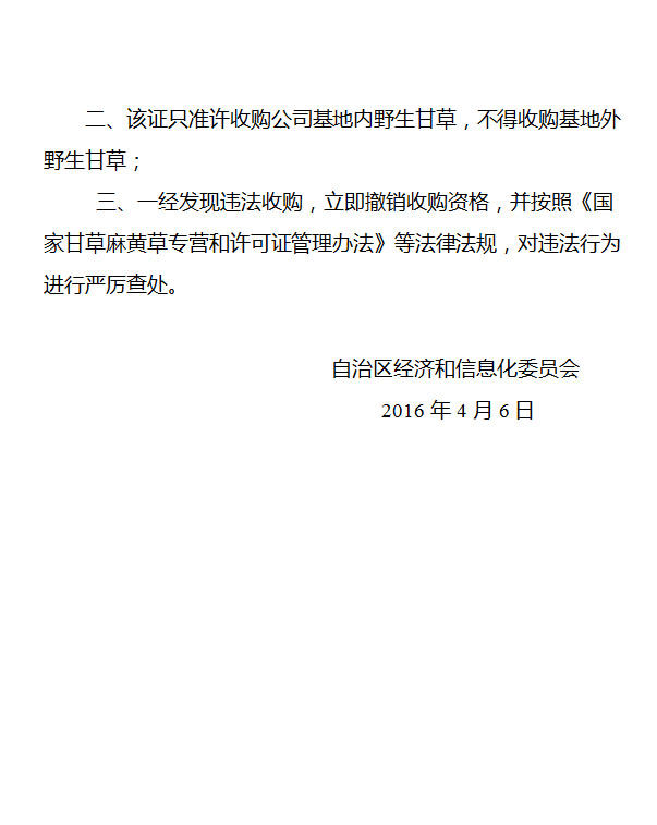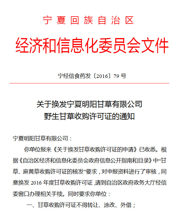 关于换发宁夏明阳甘草有限公司野生甘草收购许可证的通知