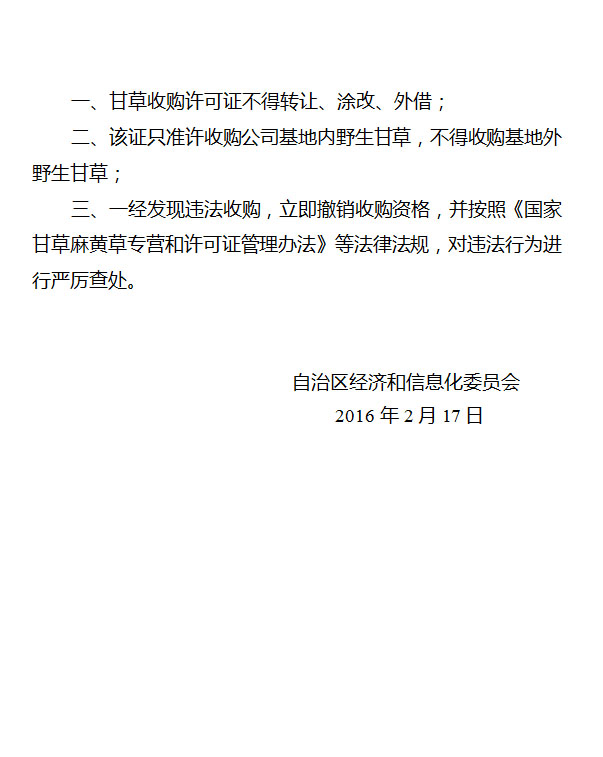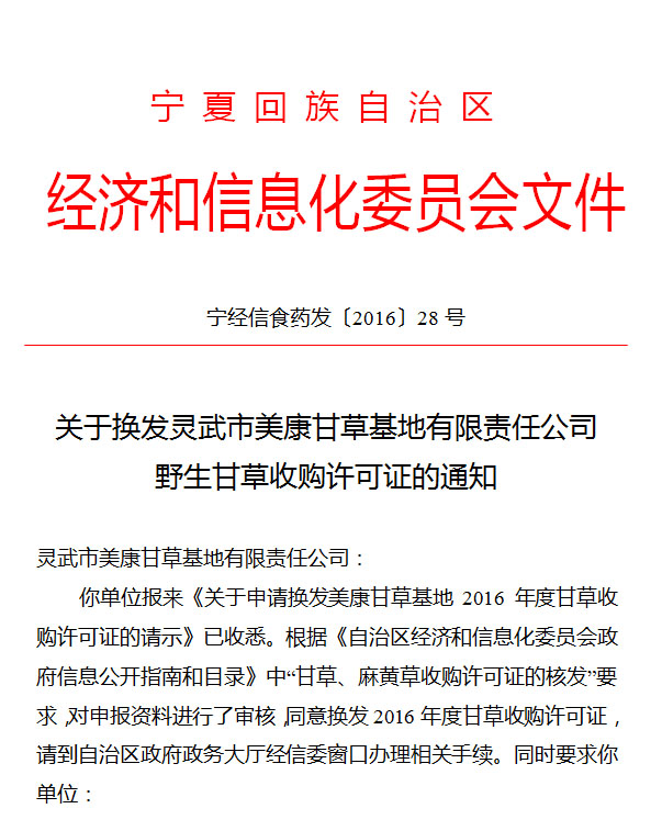 关于换发灵武市美康甘草基地有限责任公司野生甘草收购许可证的通知