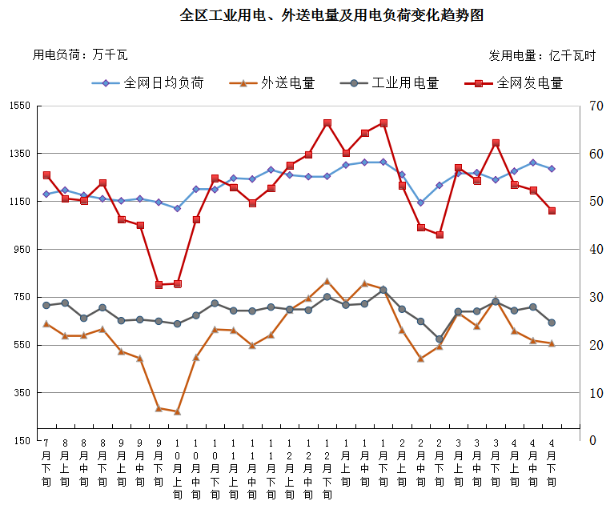2021年4月下旬,全区工业用电量、全网日均用电负荷、外送电量环比略降同比增长;大宗工业品价格同比大幅上涨,环比稳中略增;铁路运量环比略降、同比增长。